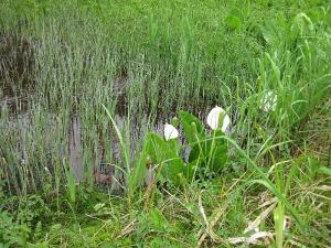 <右上には花後、葉が大きくなり始めたミズバショウがある>