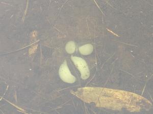 そして、四十八池湿原の池塘(湿原の中にある池)にはクロサンショウウオの卵塊がありました。不透明で、アケビの果実のような形をしています。写真は6月17日に撮影したものです。今回(7月4日)も確認できましたが、写りの良いものを使いました。