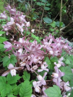 光合成ではなく、菌類から栄養をもらう腐生植物。倒木の上に生えてました。ピンクがきれい。