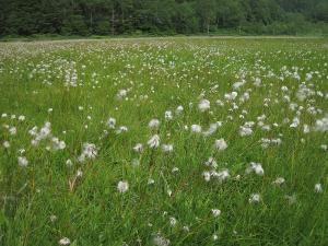 長野県下高井郡山ノ内町の田ノ原湿原ではワタスゲが一面に広がっています。