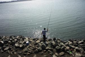 夕方になると、ウナギやハゼ類を釣ろうと多くの釣り人が