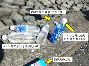 貝殻の他に釣り具やコンビニの弁当箱、ペットボトル、
