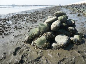 藤前干潟には、大きな石を干潟の上に積み上げた