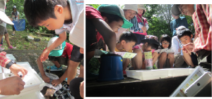 その後バットに集めた生き物たちの観察会です。大人のみなさんも解説に興味津々・・。