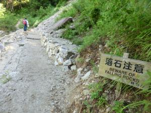 横尾から大曲までは比較的傾斜の緩い登山道を進んで行きます。一ノ俣から二の俣の間では、斜面に崩壊の跡が見られるところがあります。落石に注意するように呼びかける看板もあります。頭上に気をつけましょう。基本的には槍沢に沿って樹林帯の中を歩いて行きます。