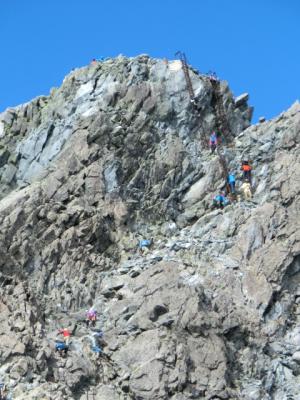 槍ヶ岳山荘から槍ヶ岳に登ります。ハシゴや鎖がかけられており、十分注意して3点確保で登る必要があります。登り用と下り用の道が分かれています。登山者が多い今の時期は渋滞が起きがちです。譲り合いながら通行しましょう。