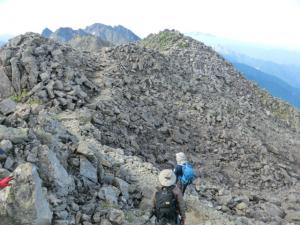 槍ヶ岳から南岳までは、晴れていれば眺望の良い道となっています。前方には穂高連峰が近づき、左には常念岳や蝶ヶ岳、右には笠ヶ岳などが見えます。ザレていて浮き石があるところもあり、気をつけて行きます。