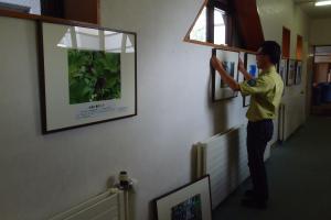 写真の設置作業の様子です。バランスを見ながら配置していきます。それぞれの写真を展示する額縁の高さなどを揃えるのに意外と苦労します。