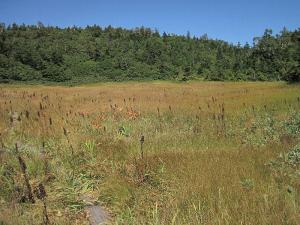 <面積はこちらのほうが広いように感じます。木道が設置されています。茶色で立っているのは、この年に開花の当たり年であったコバイケイソウ。平成25年9月19日撮影。この神の田圃は第1種特別地域に指定されています。>