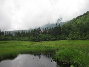 <湿原の中央にあるベンチからの眺め。ガスがかかっていなければ、白馬乗鞍岳や白馬岳を望めます。中央に見えるのは早大小屋。この神の田圃は第2種特別地域に指定されています。>