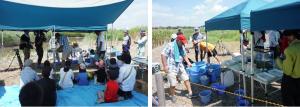 庄内川に住む水生生物の紹介や簡単な水質調査、ヨシ原に作った