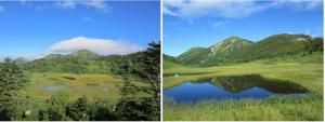 黒沢池からは、大倉乗越の急登を越えて1時間15分ほど行くと長助池、また茶臼山を越えて1時間10分ほどで高谷池、さらにそこから15分ほどで天狗の庭へ行くことができます。これらの湿原や湿性のお花畑は、冬に降る大量の雪によって育まれています。