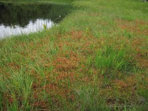 <赤いのはモウセンゴケ、黄色い花はキンコウカ、奥のほうの白い花はイワショウブ。そのほかスゲの仲間やコバイケイソウなどが見られます。8月15日撮影。>