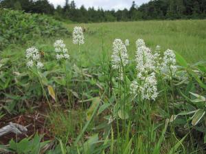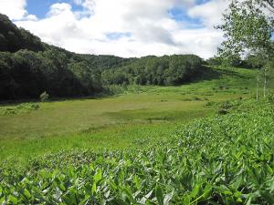 <前山湿原が写真奥に向かって広がっています。イワショウブの花が見ごろでした。8月15日撮影。>