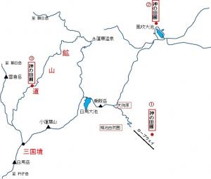 <神の田圃の位置図。今回紹介するのは図の左にある③の神の田圃とそこを通る鉱山道。青色の線は登山道。>