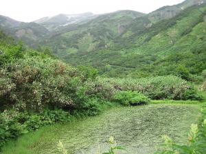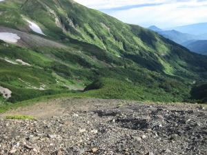 <雪倉岳の東斜面にある神の田圃。奥に見えるのは鉢ヶ岳の稜線。>
