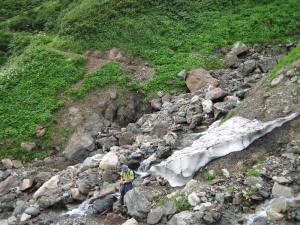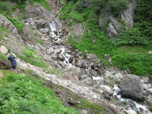 <2箇所目の飛び石伝いの渡渉。手前に残雪が見えますが、残雪が沢全体に薄く残っている時期は慎重な通過が必要になる箇所です。蓮華温泉側から撮影。>