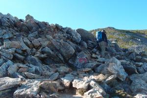 常念小屋から常念岳山頂へはやや急な登りとなっています。○や×の印がペンキで塗られていますので、それを見ながら進んで行きます。