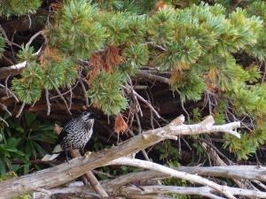 代わりといってはなんですが、白いマダラの模様の鳥がいました。知識のない私は一瞬ライチョウかと思ったのですが、小さい。ホシガラスという高山に生息する鳥です。