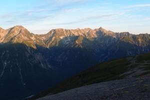 反対側に見える槍ヶ岳に徐々に日が差していく様子が印象的でした。