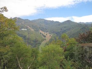 <蓮池付近から東を望む。標高の高いところでは常緑の針葉樹に混じり、黄色くなった木々が見えます。山腹は色づき始めです。東館山から赤石山にかけての山並みを撮影しました。>
