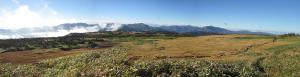 <苗場山の山頂台地には池塘のある湿原が一面に広がっています。この眺めを見ていると、山頂にいるとは思えないくらいです。苗場山山頂の山小屋付近から撮影。奥の山並みは志賀高原から上信越境の山並み。>