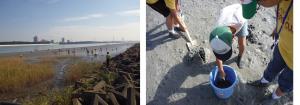 干潟観察会に協力し、参加者らに干潟の楽しさを体感して