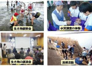 干潟の生物多様性の講演会、生きもの観察会、出前講座、ごみ清掃活動などです。