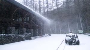 白くなり始めた上高地は、14・15日も降り続け、時折強く吹く風に吹雪・地吹雪となりました。