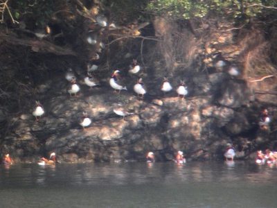たくさんのオシドリが木陰で休息している様子が分かります。