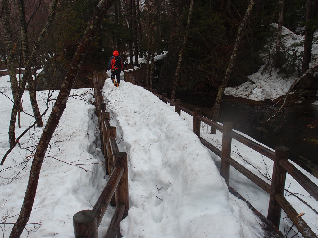 例年より雪が早く溶けてきたものの、歩道や木道はまだ雪が残っています。