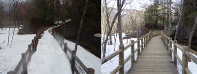 バリアフリー対応として、上高地ビジターセンター前・河童橋右岸の園路(下流を向いて右)が舗装されました。