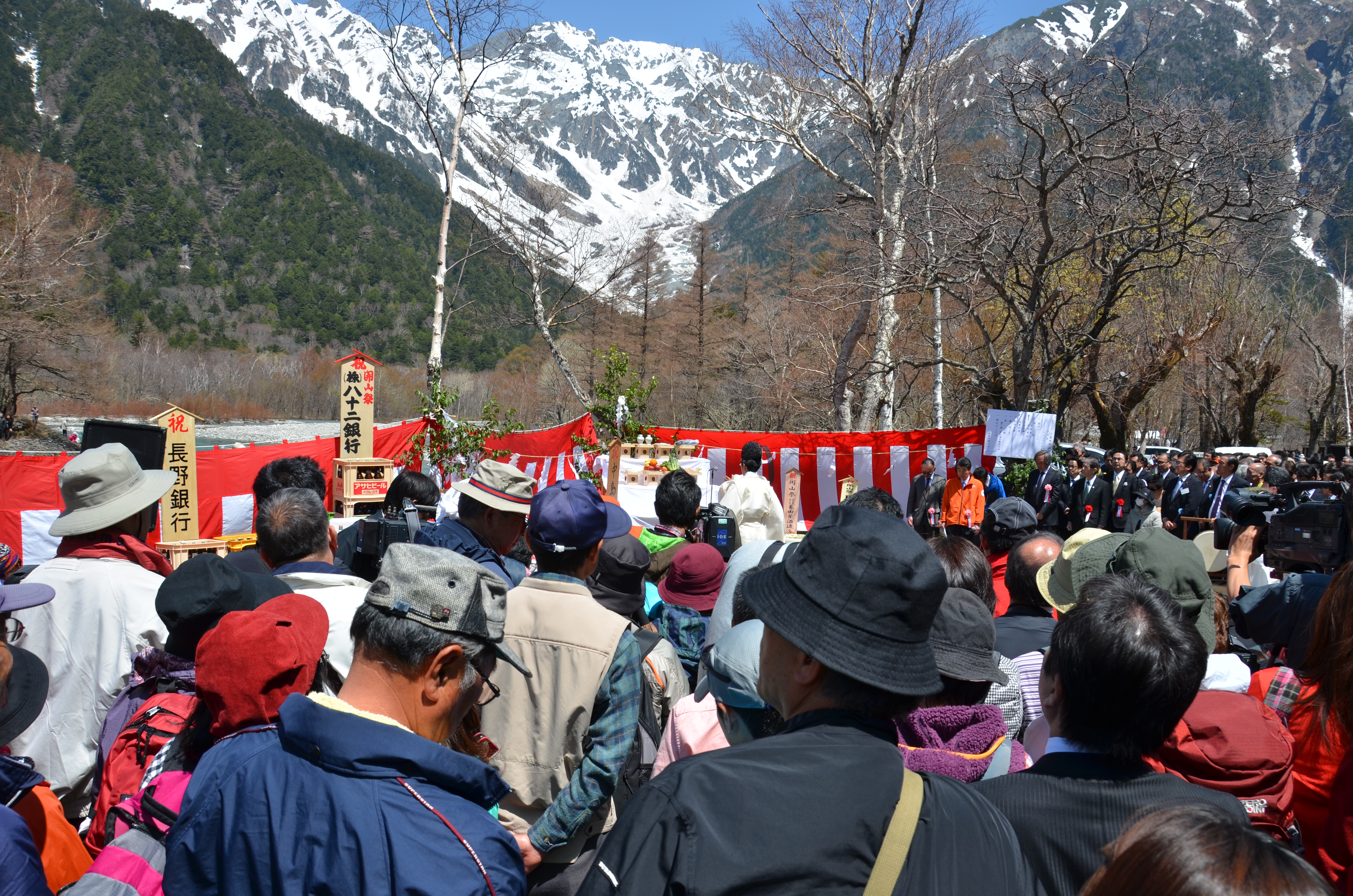 開山祭は冬場にお色直しした河童橋のたもとで、多くの人々に見守られ、神事がとりおこなわれました。開幕のファンファーレとして、アルプホルンの演奏や、獅子舞も賑やかに行われました。今シーズンも事故なく、多くの方に上高地の魅力を堪能してもらえたらと思います。