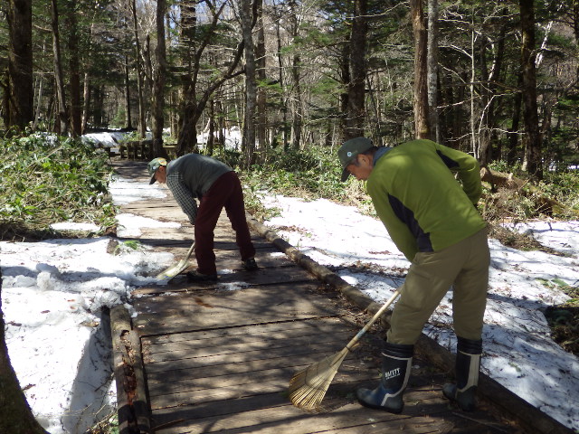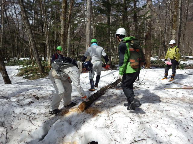 また、関係行政機関で、大正池から徳沢の間の巡視(危険箇所の点検や倒れそうな木の処理、水溜まりの解消など)を行いました。河童橋から奥は例年より雪解けが早く、春の妖精とも呼ばれる春植物の見頃は少し早まりそうな予感がします。