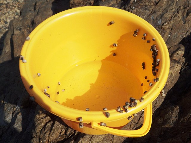バケツに貝を集め海水を入れてしばらく待ちます。
