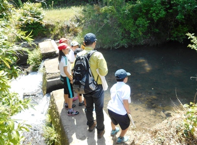 「カッパがいる」という川の淵をのぞき込んでいます。
