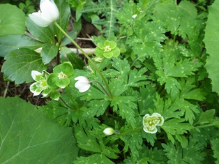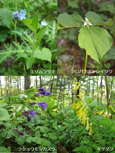 他にも足もとの花が増えてきて、タチツボスミレ、ラショウモンカズラ、エゾムラサキの紫色系や、キケマン、キジムシロ、ネコノメソウの仲間などの黄色系、シロバナエンレイソウやミヤマカタバミなどの白色系と、色とりどりの花が賑やかです。また、次は私と言わんばかりに、蕾を膨らませている種類も多くなっています。
