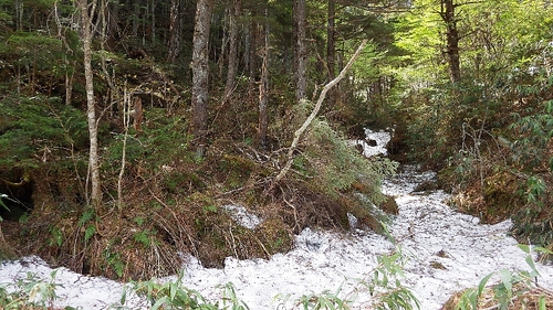 <林道から少しはずれると原生的な林が広がります。林道脇の谷沿いには残雪がありました。>