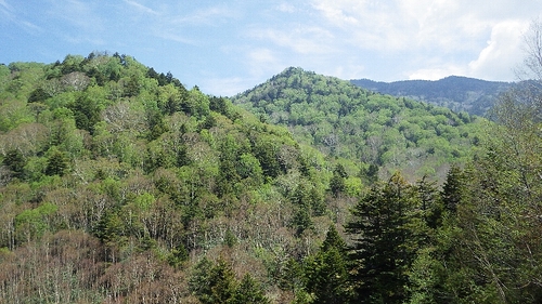 <林道から見える木々はまだ淡い色合いでした。>