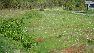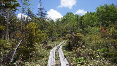 <「せせらぎコース」の上流部の高天ヶ原(たかまがはら)地区の駐車場から撮影。右上の木道がコースの一部。白く見えるのはミズバショウの仏炎苞(ぶつえんほう)。手前左のミズバショウは花期が終わり、葉が大きくなっています。>