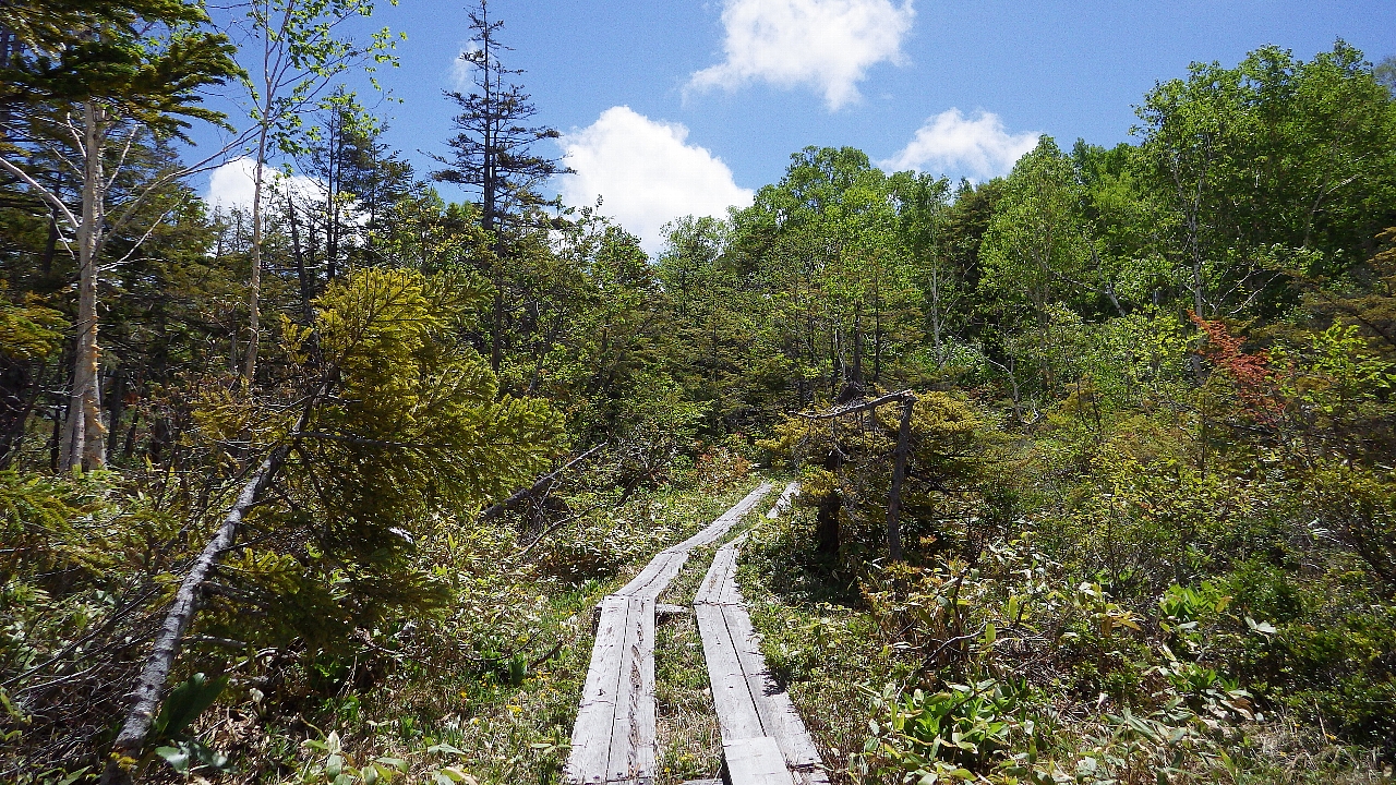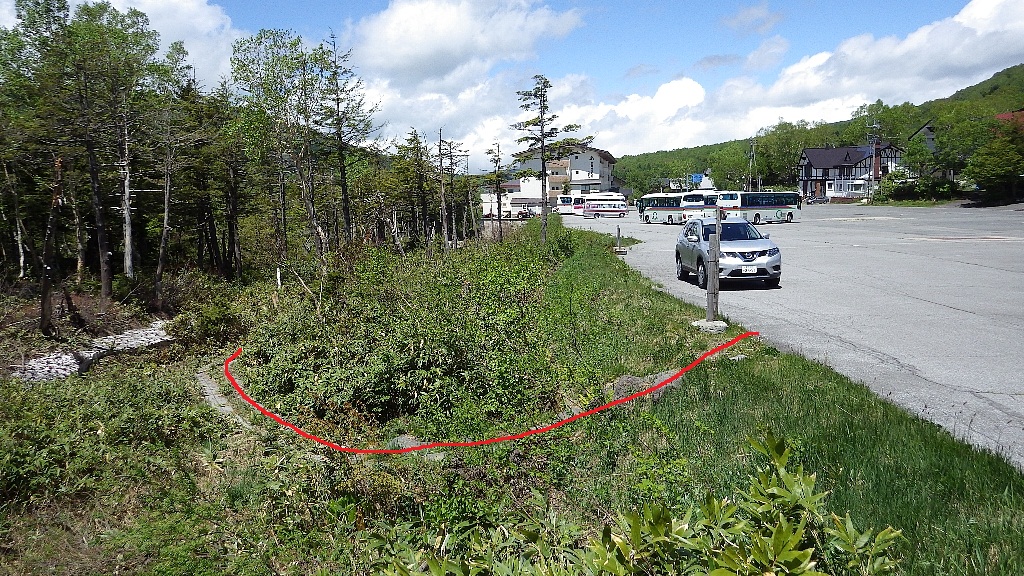 志賀高原(長野県山ノ内町)でのグリーンシーズンの楽しみ方の一つはトレッキングです。志賀高原にはトレッキングコースがたくさんあり、中には下の写真のように駐車場や宿泊施設のすぐ近くからアクセスできるコースがあります。
