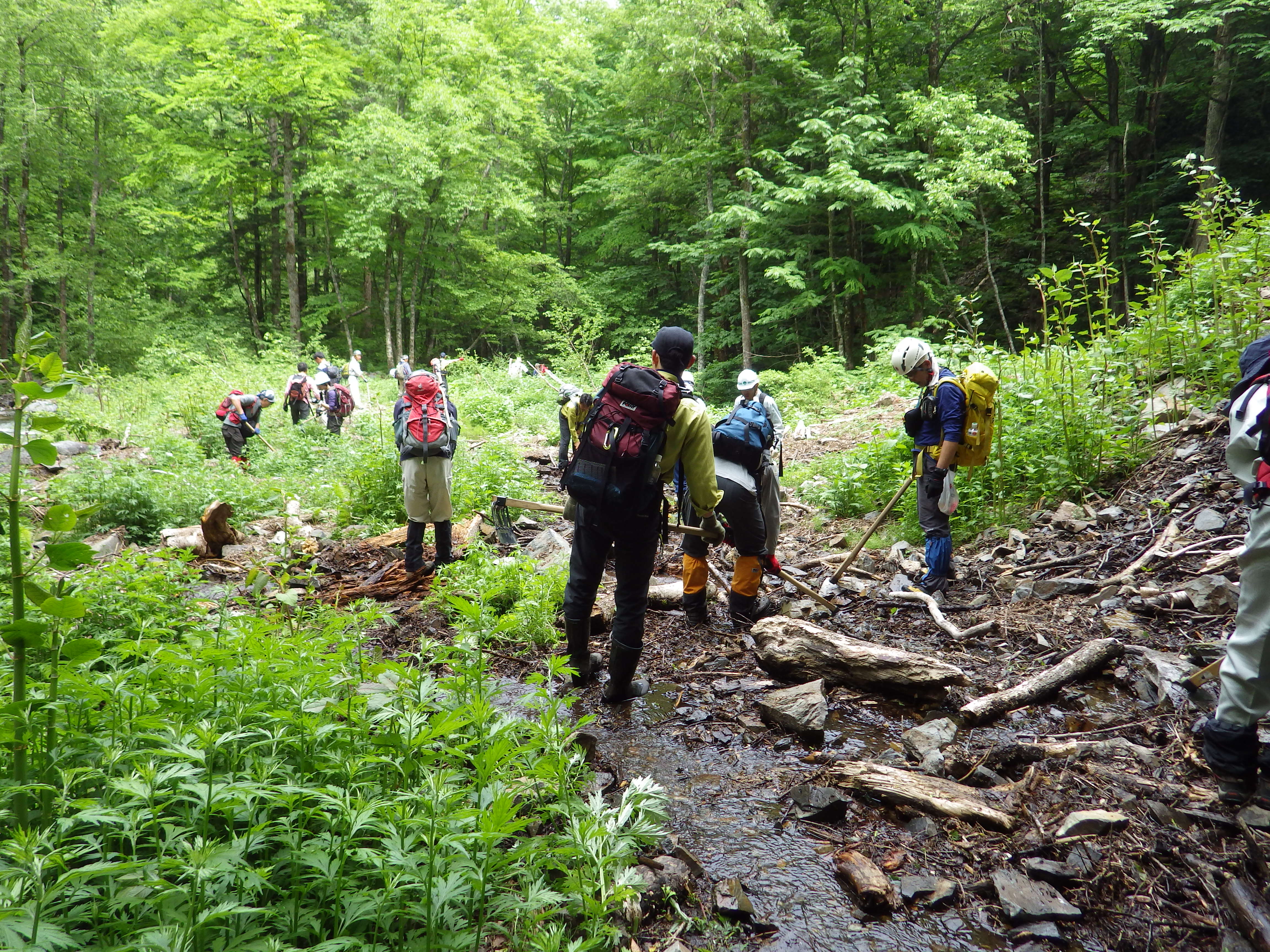 沢の水が登山道上にあふれてしまっているところは、水が流れていく道をつけます。多くの人の力で登山道は守られています。
