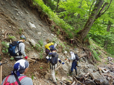 今回、この行事に先駆けて、登山道の点検・補修が、この道に関わる団体・行政・山小屋関係者などの共同で行われました。