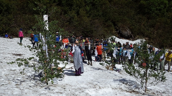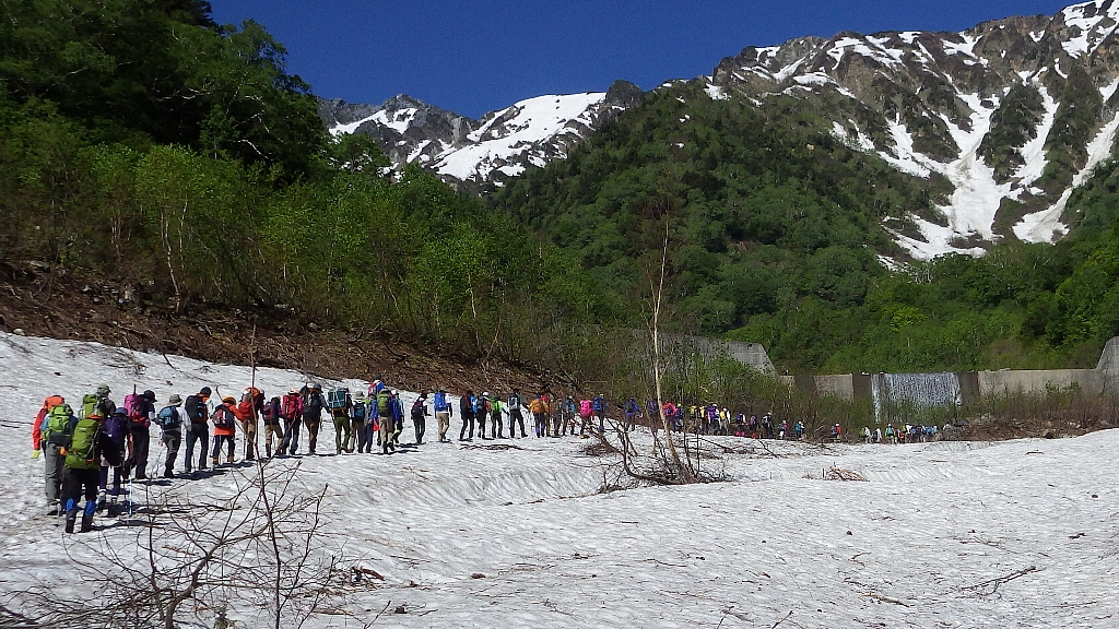 <登山口である扇沢(標高約1,433m)から祭典会場に向かう参加者の列。沢に雪が残っているので無積雪期の登山道ではなく、沢に沿って雪の上を歩きます。>