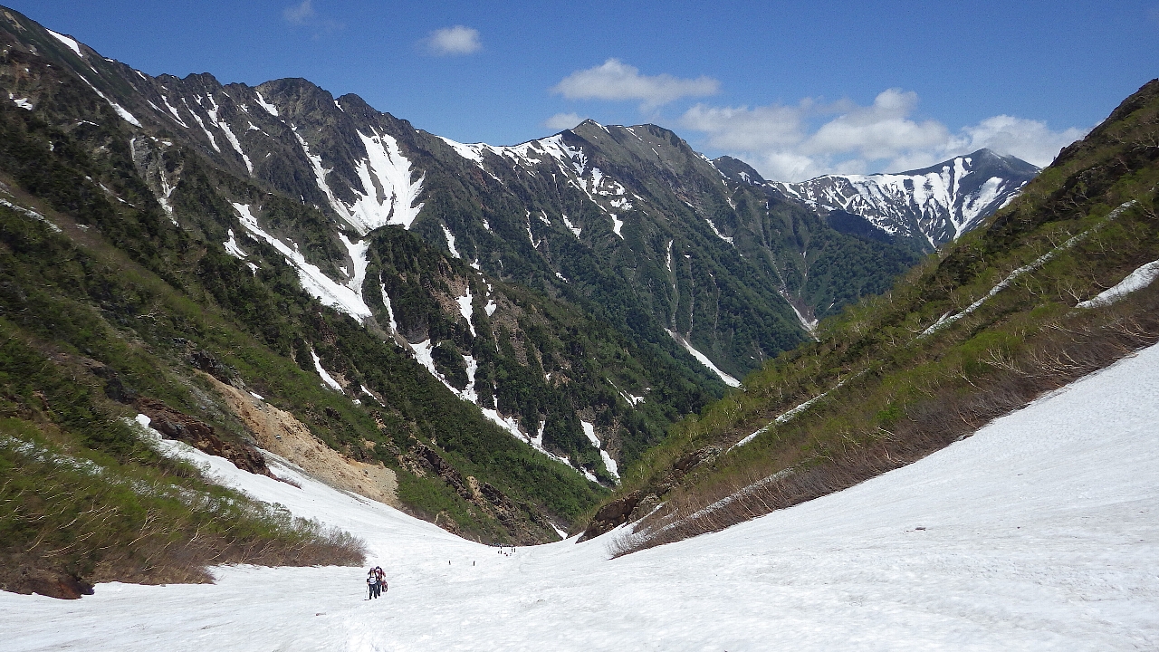 <大雪渓の途中から振り返った景色。手前の稜線の山は、右から爺ヶ岳(じいがたけ)、岩小屋沢岳(いわこやさわだけ)、鳴沢岳(なるさわだけ)。岩小屋沢岳の右奥に鹿島槍ヶ岳も見えます。>
