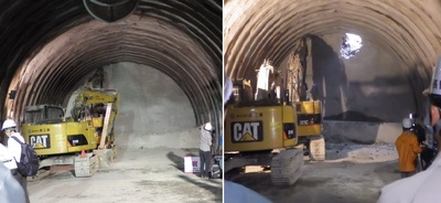 貫通式は開式の言葉で始まり、ギリギリまで掘削が進められた壁(地盤がもろい為補強しながらの掘削だったそうです)に穴を開ける瞬間を参加者全員で見守りました。
