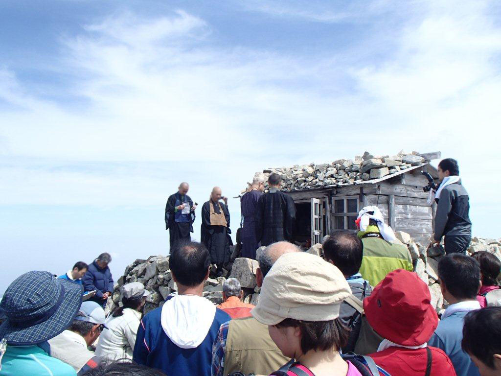 薬師岳山頂の祠に薬師如来像が安置され、登頂した約100名が再度、安全を祈願しました。