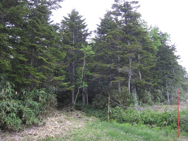 一の瀬から上る登山道は、ゲレンデとゲレンデ脇の森林を縫うように付いています。ゲレンデと森林の境には写真のように竹竿が立てられています。この目印によりスムーズに誘導されます。
