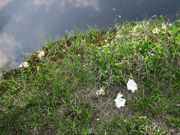 <シュレーゲルアオガエルの卵塊がありました。左の2つのように水際に産むのですが、右の3つは水際に産んだものが何らかの理由で今は水から離れています。>
