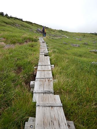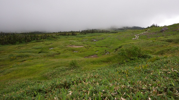 さて、苗場山の山頂部と聞いて思い浮かぶのは、広大な湿原だと思いますが、ガスがかかっていたため、広がりを見ることはできませんでした。